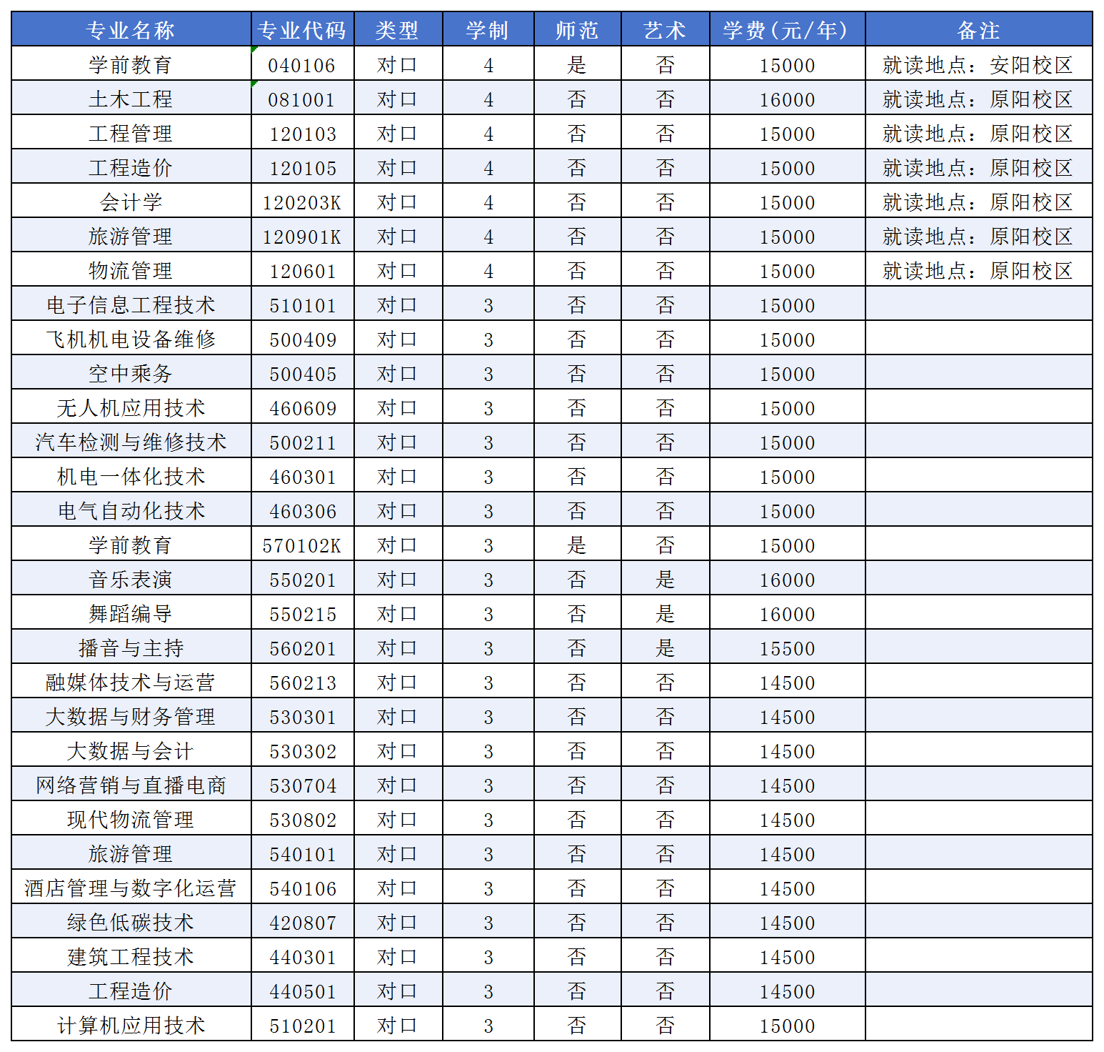 第十一条 就读安阳校区的对口本科专业有学前教育;就读安阳校区的对口专科专业有电子信息工程技术、飞机机电设备维修、空中乘务、无人机应用技术、汽车检测与维修技术、机电一体化技术、电气自动化技术、学前教育、音乐表演、舞蹈编导、播音与主持、融媒体技术与运营、大数据与财务管理、大数据与会计、网络营销与直播电商、现代物流管理、旅游管理、酒店管理与数字化运营、绿色低碳技术、建筑工程技术、工程造价、计算机应用技术。